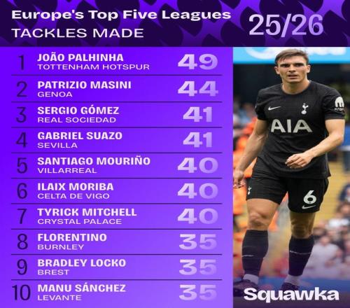 北京时间11月21日,知名数据机构Squawka统计出了2025-26赛季欧洲五大联赛的球员抢断榜,托特纳姆热刺的中场球星帕利尼亚以49次排名榜首。