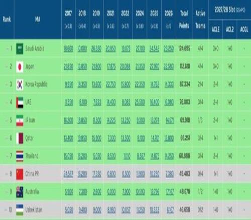 0.3分优势!中超力压澳超保住3个亚冠席位目前位列东亚区第4