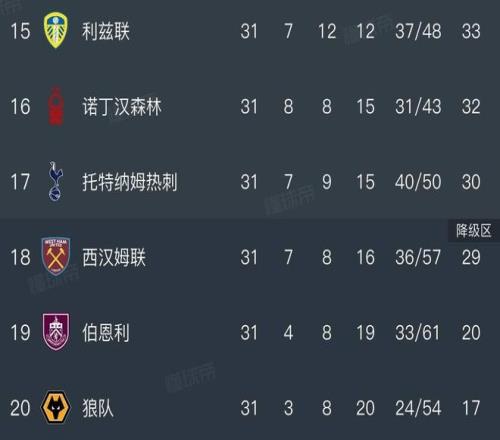 英超降级区积分榜情况